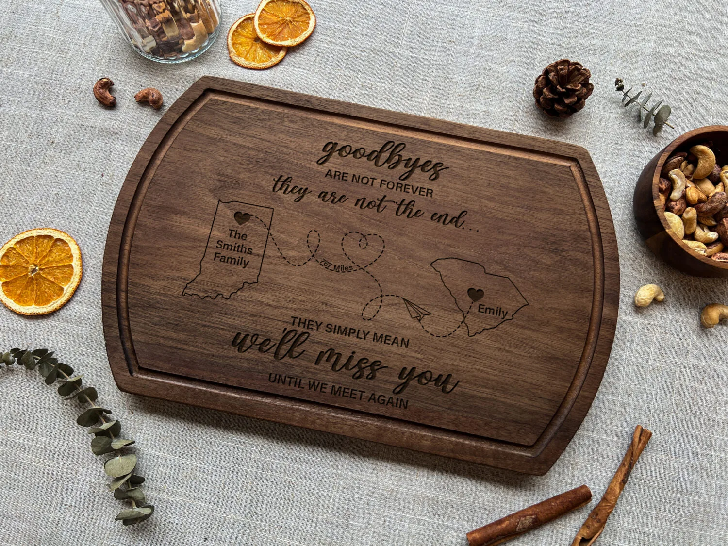 Emily’s husband had returned from deployment. She ordered a custom state-shaped cutting board with their initials marked on their Montana hometown.