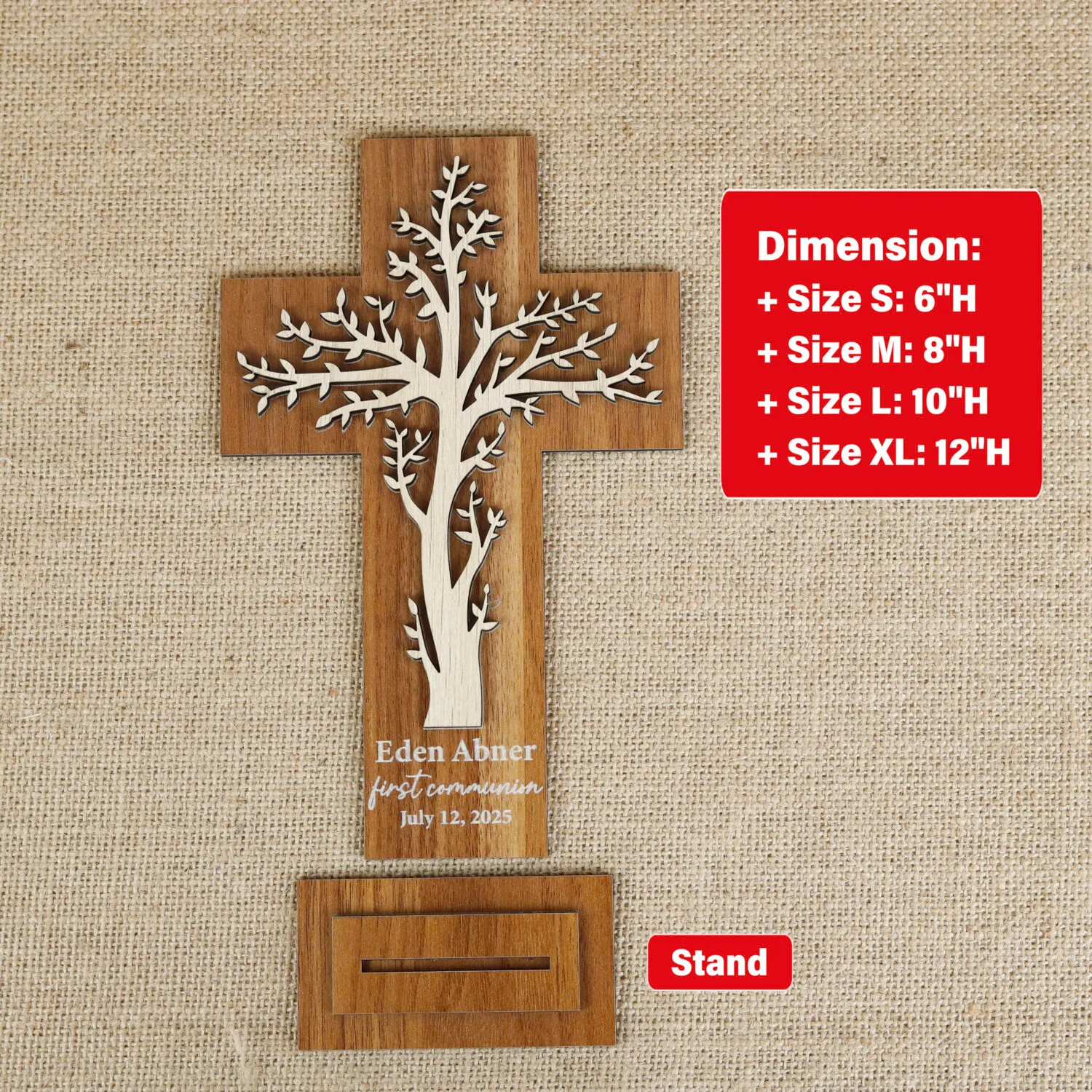Product datasheet | The personalized baptism cross is made from durable MDF wood and decorated with a tree design that stands for growth and blessings. Available in four sizes (6”, 8”, 10”, 12”) with an optional stand, it can be placed on a wall, table, or shelf.