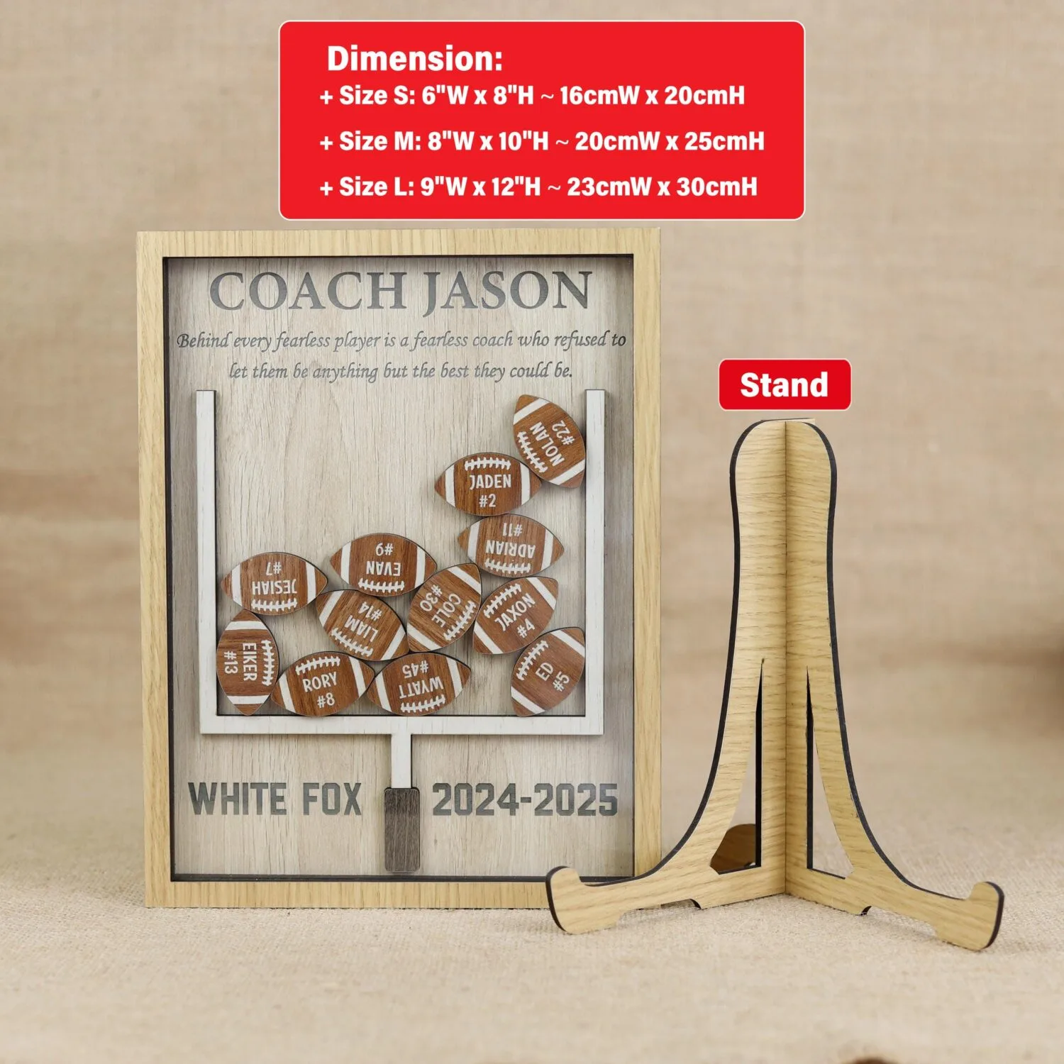 Honor your coach’s leadership with our Custom Football Coach Gift—a heartfelt, personalized thank-you sign that celebrates team spirit and dedication. Moreover, this carved football design instantly conveys gratitude and pride in a stylish, meaningful way. Personalized Custom Football Coach Gift sign made from MDF and acrylic. Sizes: 6×8″, 8×10″, 9×12″. Includes stand and wall hanger. Customize with coach’s name, team, year, and players. |