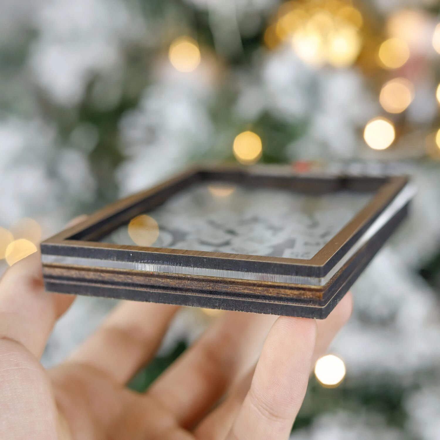 Made from MDF and acrylic, this ornament uses a five-layered structure to provide depth and clarity. Each layer is securely bonded using premium glue, ensuring durability and alignment. The engraving is crisp, and the design captures every name, number, and element beautifully.