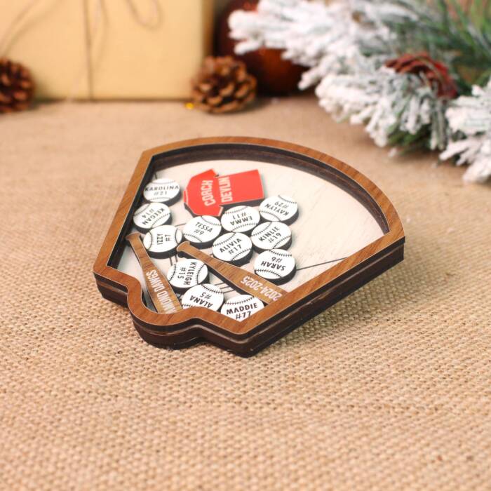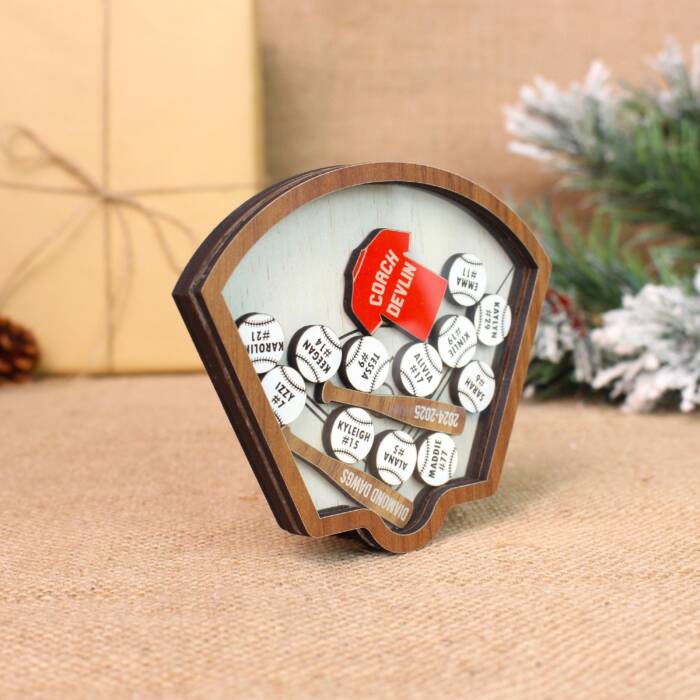 Capture the memories of your squad with this baseball team magnetic shaker. Engrave your team’s name, list player names and show the year for a keepsake that honours players, coaches and parents alike. For example, the listing supports team name, year and up to 15 names for the 4.5″ size or up to 25 names for the 5.5″ size.