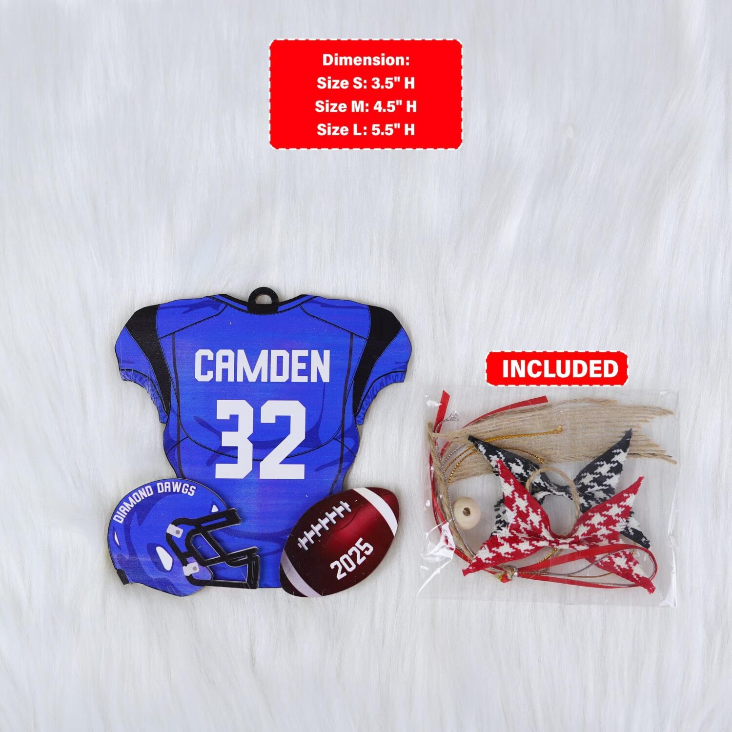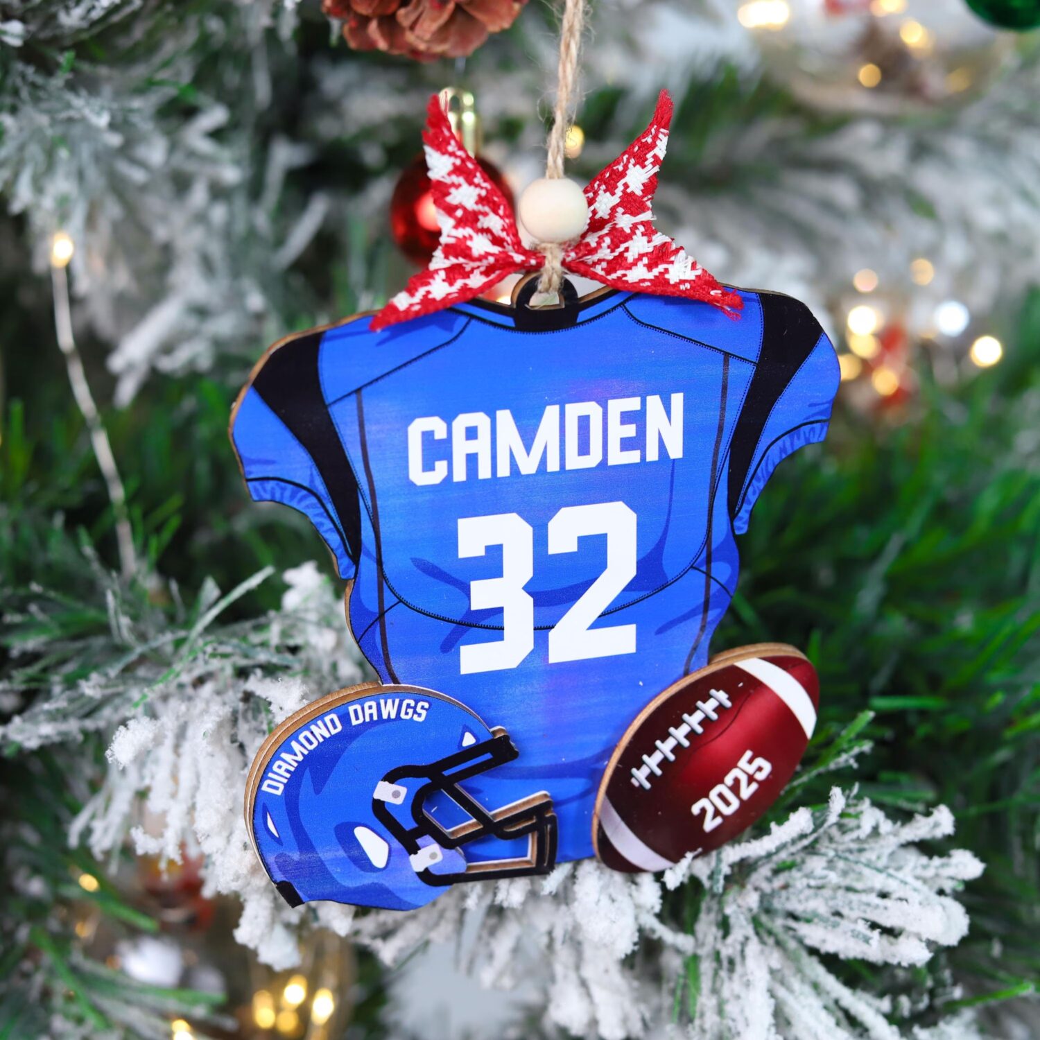 Each ornament is crafted with care using laser-cut wood and acrylic layers to give depth, contrast, and durability. The design includes a football shape or silhouette, engraved name, jersey number, and optional team logo or year. The layers ensure that text and graphics pop, creating a professional and polished look.
