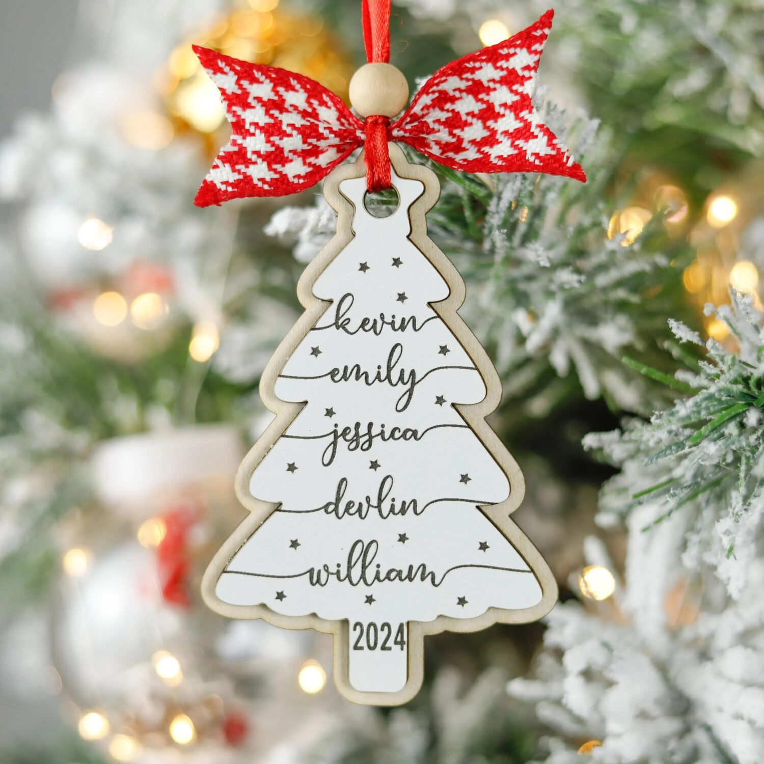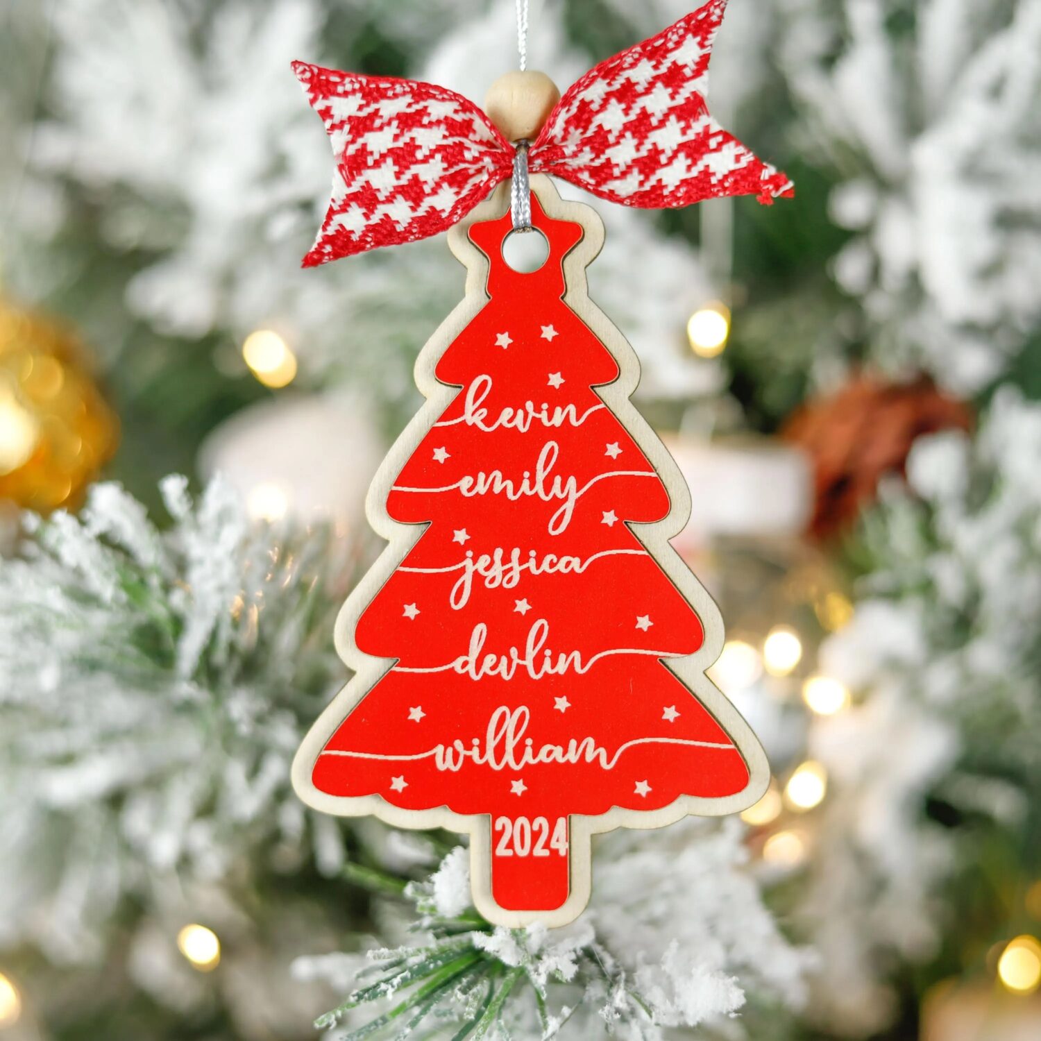 This ornament is made from a 2-layer plywood / wood construction, bonded with premium glue for strength and durability. The names are precisely engraved for long-lasting clarity.