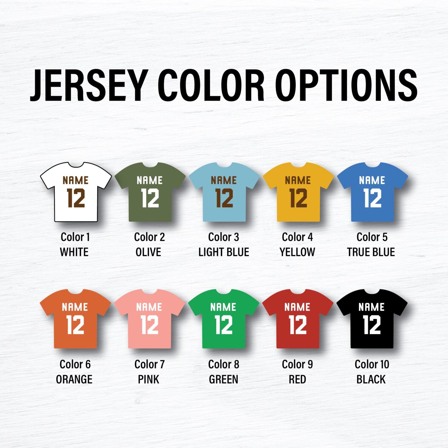 Choose jersey color from options: white, olive, light blue, yellow, true blue, orange, pink, green, red, black