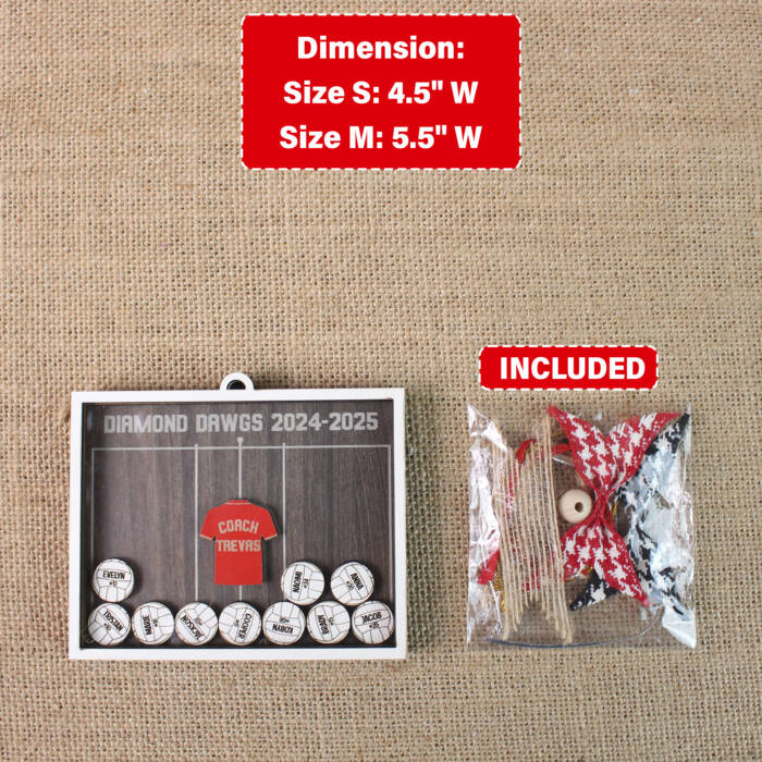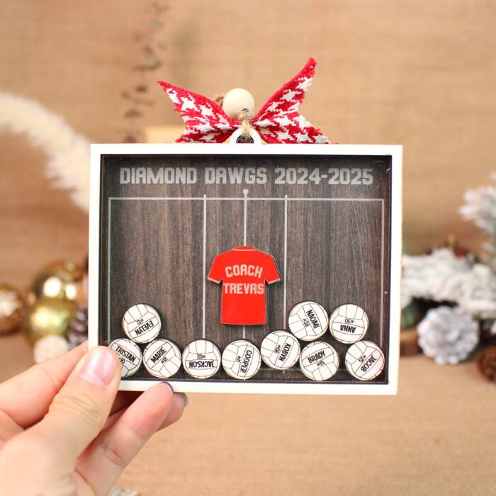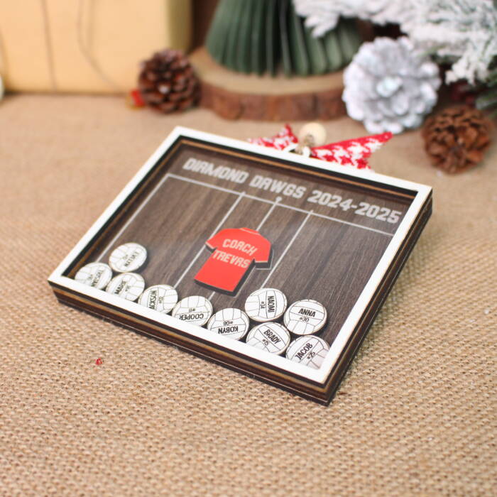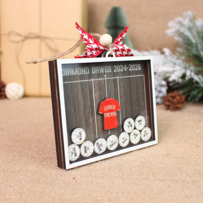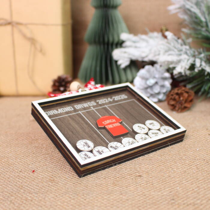 Crafted from premium layered materials like MDF and acrylic, this ornament features a “shaker” design—small pieces inside that move—adding fun and dimension. The personalised text is engraved (or printed) clearly to last. From the listing’s details: “Add the coach’s name, team’s name & year” and size options for names and numbers.